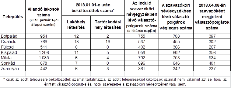 A Nemzeti Választási Iroda a Belügyminisztériumtól kapott adatok alapján megvizsgálta, hogyan alakult a Szabolcs-Szatmár-Bereg megye 4. számú egyéni választókerülethez tartozó Botpalád, Csaholc, Fülesd, Kispalád, Milota, Sonkád, és Zsarolyán lakossága.